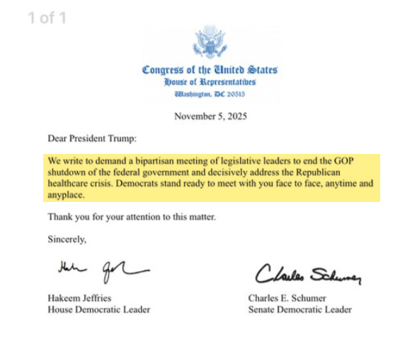 参议院少数党领袖查克·舒默(Chuck Schumer)与众议院少数党领袖哈基姆·杰弗里斯(Hakeem Jeffries)联名致信特朗普总统,信中明确表示:“我们致信要求举行一次两党立法领袖会议,以结束共和党造成的政府停摆,并果断解决共和党的医疗保健危机。民主党人随时准备与您面对面会谈。”