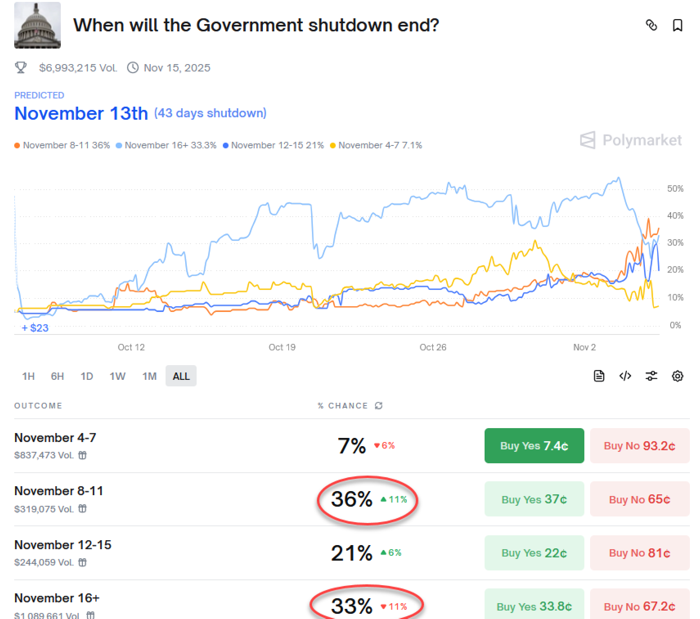 尽管短期前景(根据Polymarket数据,11月11日前结束的可能性仅为36%)仍不明朗,但政治风向的转变和经济代价的累积正在为问题的最终解决创造条件。投资者应密切关注两党领袖会面的进展以及温和派议员所推动的具体解决方案,任何实质性进展都可能迅速提振市场情绪,缓解短期经济下行风险。