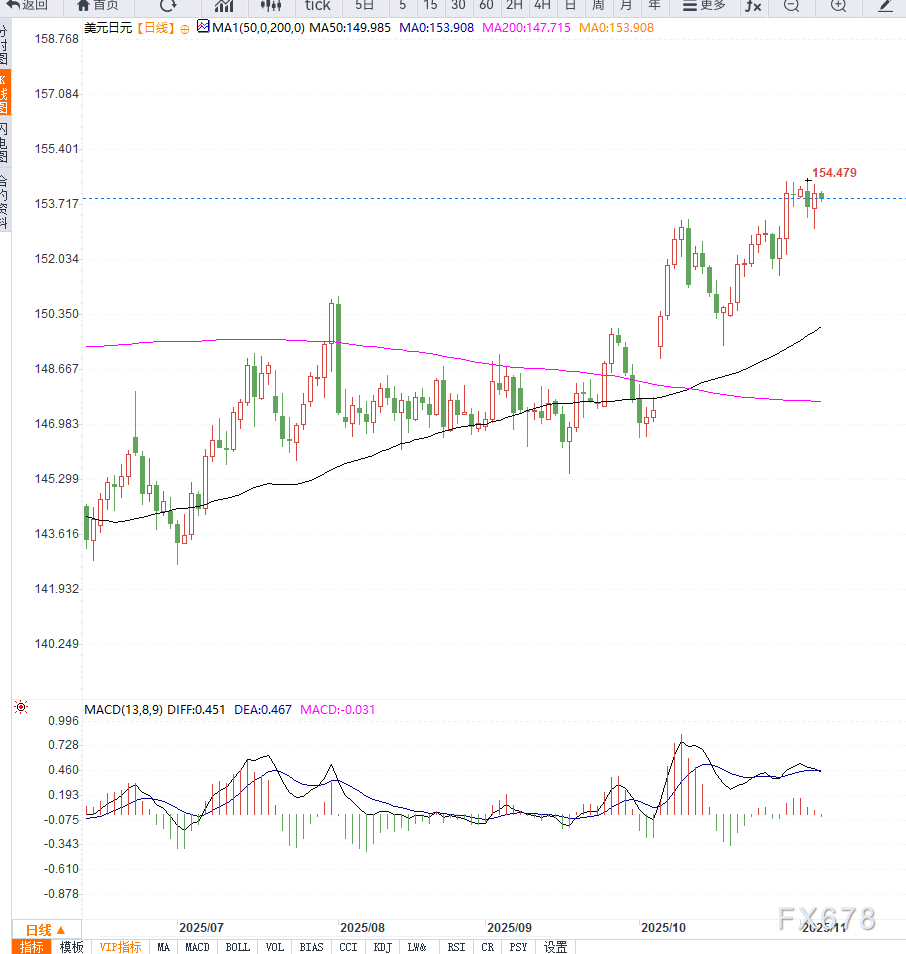 日线图显示,USD/JPY 近期处于 153.65–154.45 的横盘整理区间,价格多次试探上方阻力未果。短期均线 20 日和 50 日均线接近交汇,显示市场短线多空均衡。