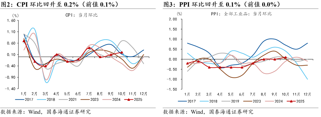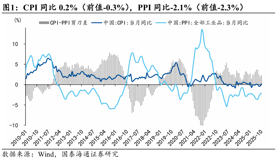 事件:10月CPI同比增速0.2%,环比0.2%;PPI同比增速-2.1%,环比回升至0.1%。