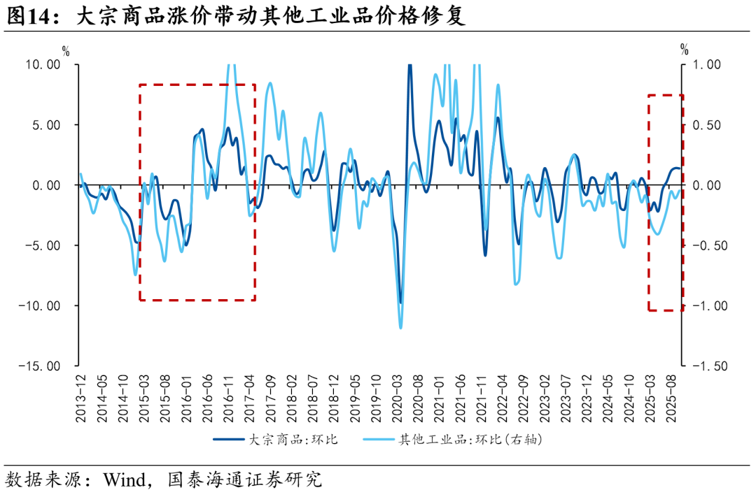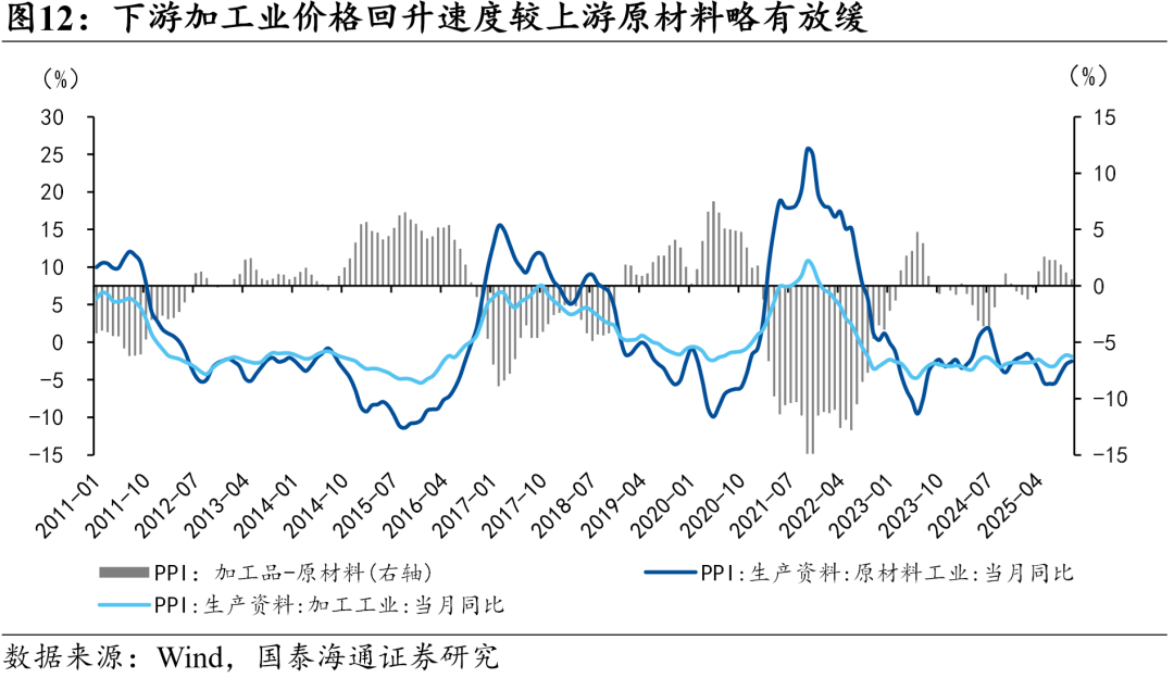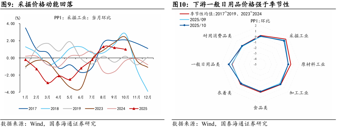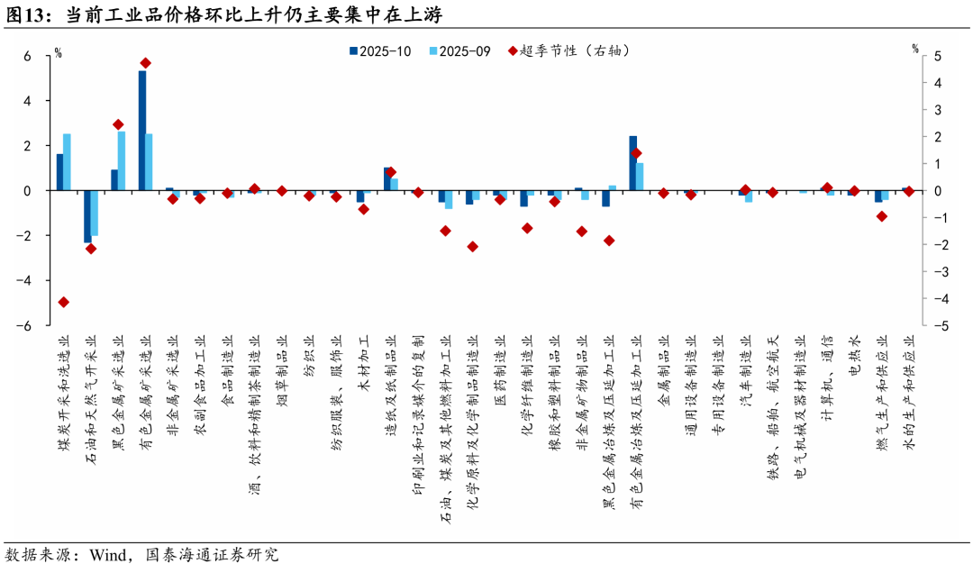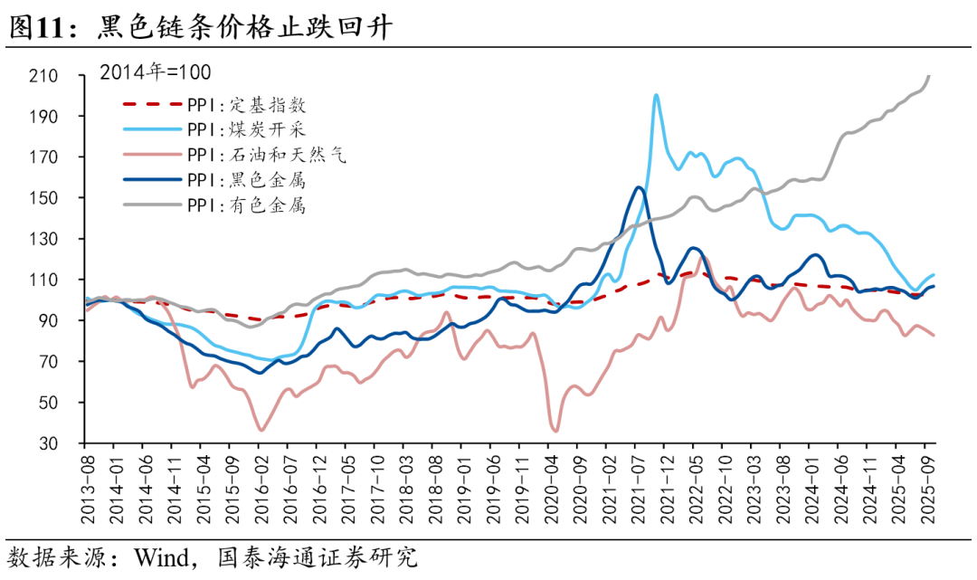 静待价格传导向下游扩散。上游原材料价格回升动能在10月有所减弱,下游加工业价格修复速度较上游原材料也略有放缓,但除部分原材料加工行业之外,其他多数行业价格环比已持平季节性,表明反内卷式竞争背景下的价格治理已有初步成效,9月工企利润数据也显示部分下游消费品行业的利润增速有所改善。