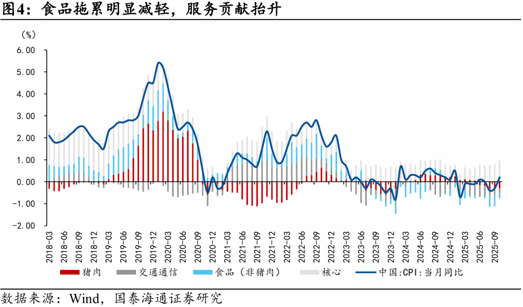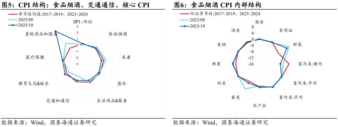 食品拖累减轻主要是因为环比回落幅度低于2024年同期,基数效应托举了整体读数。10月随着北方持续降雨及华南冷空气频繁南下,产区货源供应收紧,鲜果鲜菜价格并未如往年一般进入节后低迷期,反而在供需失衡与天气扰动的交织中稳步上行。猪肉仍然是食品中的主要拖累,猪周期仍处于磨底阶段,企业去库压力较高,母猪产能释放,生猪及猪肉供应较为充足,导致价格进一步回落。随着后续气温下降,终端需求或缓慢恢复,预计猪肉价格将震荡回升。