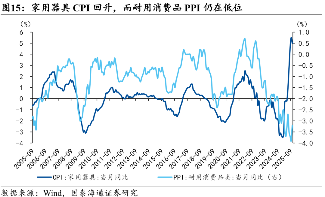 10月通胀读数中较为显眼的莫过于核心CPI加速攀升。年初以来核心通胀与整体CPI同比之差持续扩大,服务项对通胀的贡献连续抬升。主要是以下三方面原因:一是反内卷治理下,上游原材料涨价带动了下游消费品价格止跌回稳,如汽车行业;二是财政政策积极发力带动需求回升,相关消费品价格快速上涨,如家电行业,其CPI回升独立于PPI;三是输入型通胀的影响,如黄金暴涨带动金饰品价格连续大幅上升。