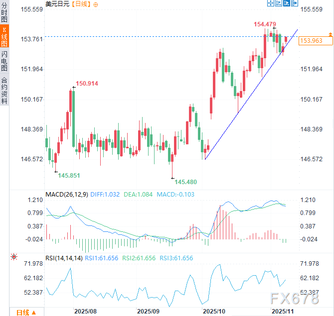 周一(11月10日)美元兑日元延续前一交易日涨势,亚市时段震荡上行,上涨约0.37%至153.97附近。