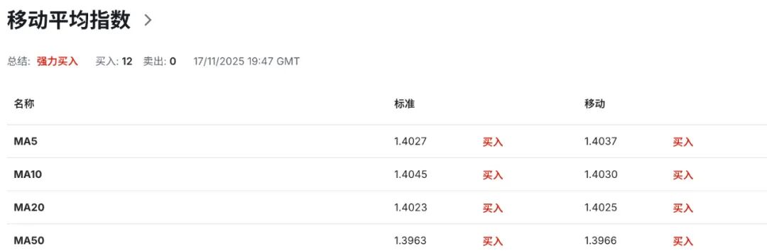 技术指标显示,4小时级别布林带上轨切入点指向1.4045区域水平为汇价提供短线动态阻力,布林带中轨运行线指向的1.4020区域水平为走势界定潜在强弱分化,布林带下轨切入点指向的1.3995区域水平为汇价提供短线动态支撑。当前汇价窄幅震荡于布林带上轨与中轨之间,显示多头动能占据相对优势。布林带开口维持收缩状态,表明短线波动率有所下降,汇价或维持短线震荡格局。与此同时,4小时级别14日RSI相对强弱指标处于50.20附近中性区域,表明当前多空力量维持相对均衡状态,汇价或面临阶段性方向选择。