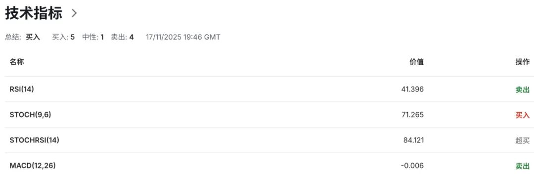 从日线技术指标看,英镑兑美元仍运行于布林带中轨与下轨之间的弱势区域,整体趋势偏空。布林带开口收窄,反映市场波动率有所下降,汇价进入震荡整理阶段。目前上轨已下移至1.3390附近,构成短期动态阻力;下轨位于1.3000整数关口,提供对应动态支撑;中轨1.3200一线则可视为判断多空力量转换的分界线。此外,14日相对强弱指标(RSI)目前读数42,也显示当前空头动能仍占优势。