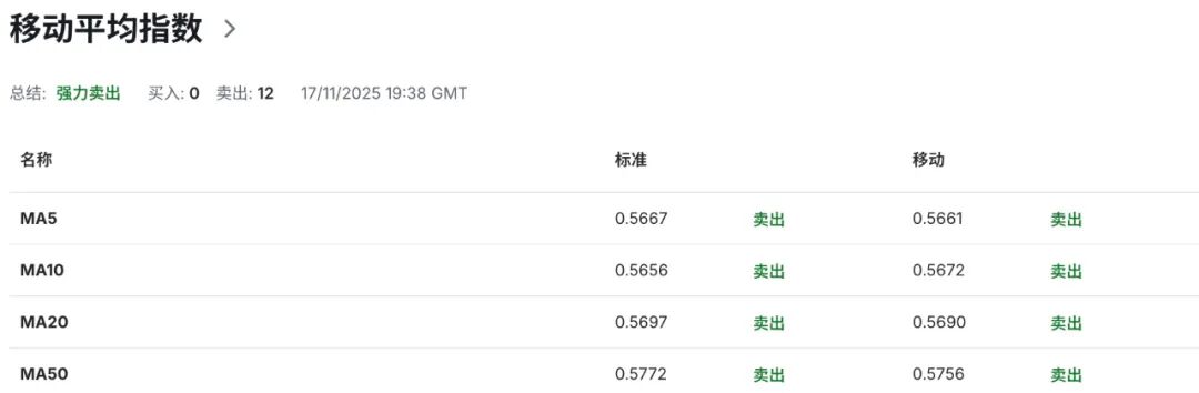 技术指标显示,日图级别上,纽币自布林带下轨所指向的0.5605附近区域获得一线支撑后已连续第6个交易日维持反弹格局,伴随14日相对强弱指标RSI自30以下深度超卖区间回升至40附近区域,反映市场集中性抛售边际效应正在减弱,尽管空头动能当前仍然占据完全主导优势局面,但也提示短线“超涨—均值回归”风险在累积,需防范空头动能“加速-衰竭-回撤”的节奏切换。然而,在纽币短期未能回收至布林带中轨上方,以及RSI指数未能成功进入55-45强弱平衡区之前,当前任何上行仅视为技术性反弹以及汇价调整阶段,而非真实技术性或趋势性级别扭转。布林带中轨当前位于0.5700附近区域,为纽币短期价格走势结构提供多空力量以及强弱格局核心分化枢纽,若汇价可成功回收至该区域上方,则才将有望触发真实性技术反弹并推动汇价进一步走高测试布林带上轨所指向的0.5800动态区域阻力提供积极信号。布林带开口维持扩张,预示纽币短期波动率上升与下行趋势模板成立仍然保持同频,提示汇价短期“高位回落-下行延续”风险仍然维系较高水平。与此同时,布林带下倾形态限制纽币反弹斜率,MACD显示DIFF-0.0036、DEA -0.0035、MACD柱状图维持负值区间与双线位于零轴下方维持放大,显示空头动能维持放量阶段,提示空头动能偏强持续性仍在上升。如若后续柱状图呈现负值缩窄并出现零轴上方的回测,则才将有望触发真实技术性以及趋势性反弹的概率。