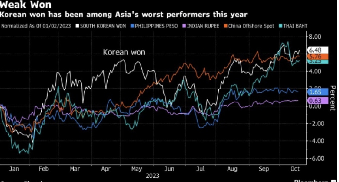 美联储政策前景的不确定性,使韩国央行有另一个动机,为进一步收紧货币政策的可能性敞开大门。尽管投资者预计美联储将在11月1日结束的会议上保持利率稳定,但他们也预计,美国政策制定者将不会宣布紧缩周期已见顶。过去一个月,韩元兑美元汇率一直是表现最差的货币之一,部分原因是两国之间的汇率差距越来越大。