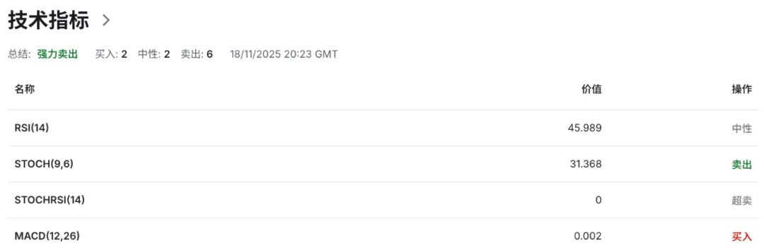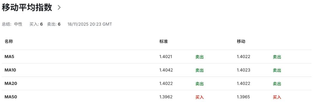 技术指标显示,日线级别布林带上轨切入点指向的1.4115区域水平为汇价提供短期动态阻力,布林带中轨运行线指向1.4020区域水平为其走势界定潜在强弱分化,布林带下轨指向的1.3925区域水平为汇价提供短期动态支撑。当前汇价下穿至布林带中轨运行线下方运行,呈现多头动能的显著放缓迹象,当前空头力量占据相对优势。布林带开口未呈现明显扩张迹象,表明短期波动率保持相对平稳。与此同时,14日RSI相对强弱指标降至46.00附近区域,但未实质性摆脱55-45中性水平,表明当前多空力量仍维持相对均衡状态,汇价或进入震荡格局。