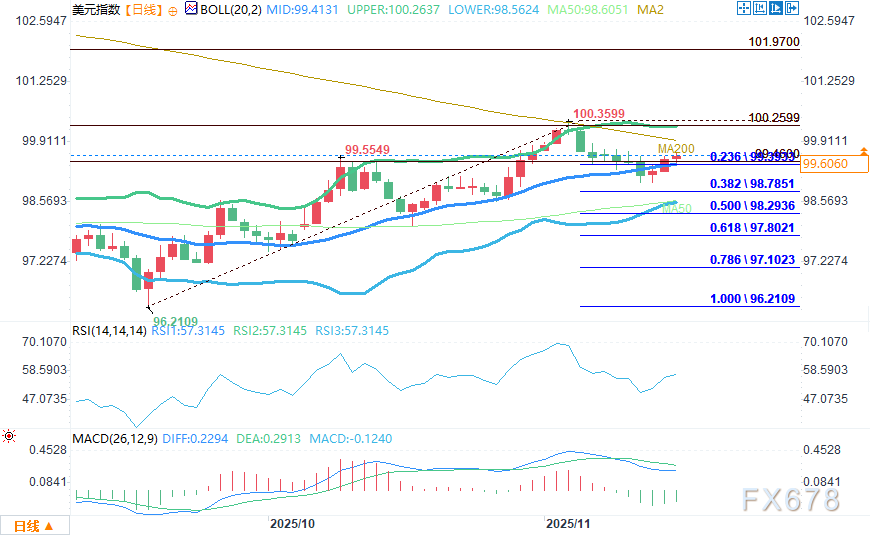 该指数目前仍被200日均线(99.62)压制,同时获得50日均线(98.61)支撑。价格在突破布林带中线(99.41)后小幅走高,在新数据公布前,这一中点位置成为多空双方相互试探的博弈战场。
