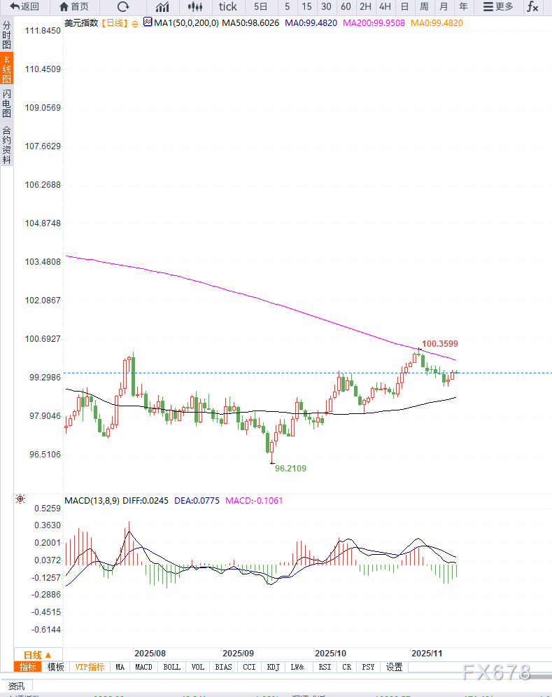 从日线结构来看,DXY 在20日均线下方运行,短线趋势仍偏弱,但在99.50 区域存在强支撑。若指数能站稳该区间并重新上破 20 日均线(约 99.90),将打开向 100.50 的反弹空间。
