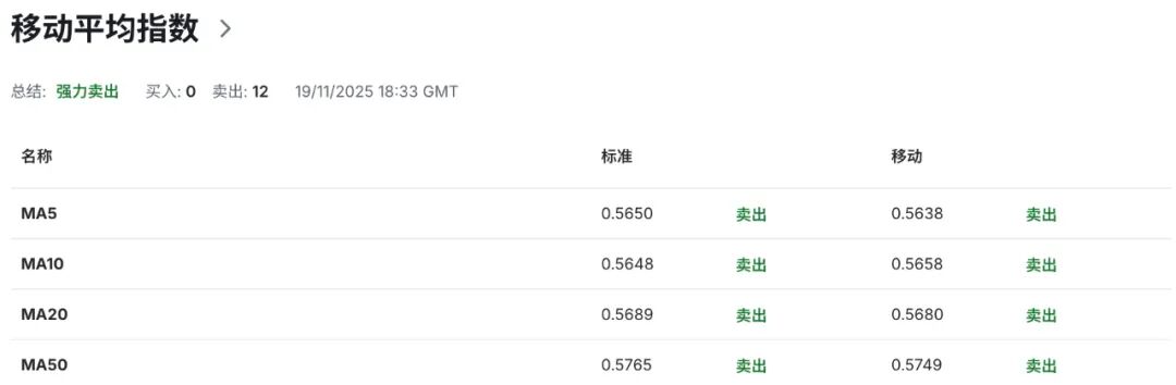 技术指标显示,日图级别上,纽币整体价格走势继续围绕于布林带中轨至下轨区间为中心开展核心交易中枢,伴随14日RSI相对强弱指标维持40以下弱势区间,并一度触及30超卖临界点,反映量价关系同步呈现弱势趋向边际化效应,空头动能仍占据主导优势,对汇价反弹构成显著压制力,而同时也提示续防范RSI指数触及超卖临界点后所存在的“超卖-均值回归”风险在积累。与此同时,布林带维持向下开口,表明短期下行端动能保持充沛,结合MACD显示DIFF-0.0033、DEA -0.0038、DIFF值高于DEA,确认纽币短期空头趋势。MACD柱状图维持负值区间与双线位于零轴下方维持放大,显示空头动能维持放量阶段,提示空头动能偏强持续性仍在上升。如若后续柱状图呈现负值缩窄并出现零轴上方的回测,则才将有望触发真实技术性以及趋势性反弹的概率。此外,20日,50日以及100日均线系统呈现明显空头排列,近端曲线向下倾斜率限制纽币名义抬升概率,表明汇价短,中周期优势仍显著偏向空头一侧。布林带中轨当前位于0.5695附近区域,为纽币短期价格走势结构提供多空力量以及强弱格局核心分化枢纽,若汇价可成功回收至该区域上方,则才将有望触发真实性技术反弹并推动汇价进一步走高测试布林带上轨所指向的0.5790动态区域阻力提供积极信号。而布林带下轨当前向下方延伸至0.5585一线区域,为纽币短期价格走势提供潜在动态支撑。