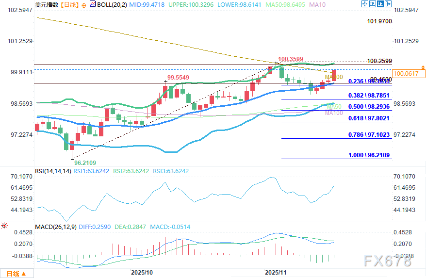 周三(11月19日)美盘时段,美元指数震荡上行,盘中上破200日均线和100美元重要心理关口。随着11月5日创下的100.360主要高点重新进入视野,市场在美联储10月会议纪要发布前持仓态势趋于稳固。