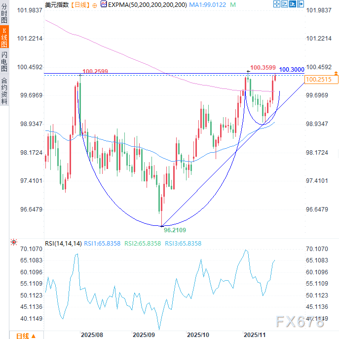 美元指数自9月17日在96.21的前期支撑位附近触底后,便持续稳步走高,期间市场对12月降息的预期逐渐减弱也为美元提供了助力。周四美元指数连续第五个交易日走强,涨幅约0.14%,稳居100关键整数关口上方。上行方面,美元指数正测试100.30附近阻力。若能有效突破该位置,将确认96.40附近可能形成的双底形态,并为后续上攻101.00关口、进而挑战101.50附近奠定基础。技术形态上亦可解读为为期三个月的杯柄形态,一旦确认突破,同样释放看涨信号。下行方面,只有当美元指数跌破上周低点(98.99)及99.00关口附近的上行50日指数移动均线(EMA,99.01),看涨态势才会转为中性。