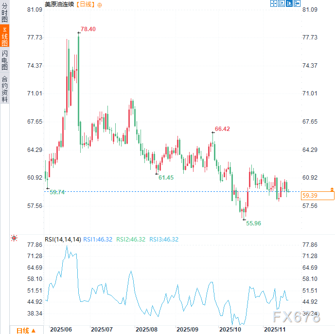 (美原油连续日线图,来源:易汇通)北京时间10:57,美原油连续现报59.39美元/桶。