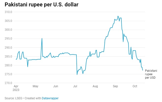 根据LSEG的数据,9月初,巴基斯坦卢比兑美元汇率重挫跌至307卢比兑1美元的历史低点。