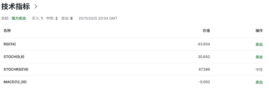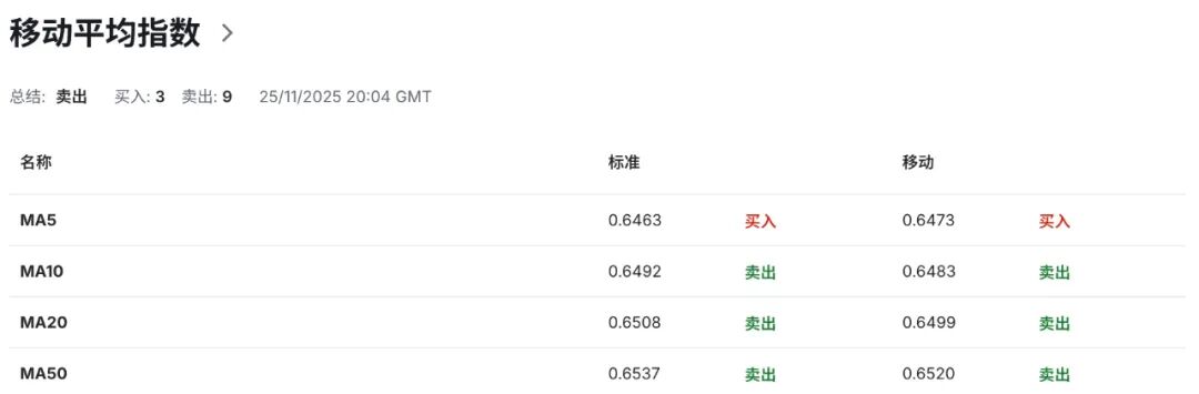 从日线级别技术指标分析,澳币目前维持在布林带中轨与下轨之间的弱势区间运行,整体技术结构呈现偏空格局,表明当前市场由空头力量主导。布林带通道初现收窄迹象,显示市场波动性有所降低,这暗示尽管价格整体走势偏弱,但下行动能有所减弱。目前布林带上轨0.6580构成短期动态阻力,下轨0.6430提供对应动态支撑,而中轨0.6510则可视为判断多空力量转换的关键枢轴水平。动能指标方面,14日相对强弱指标(RSI)当前读数位于42的相对弱势区域,确认市场暂时处于空头主导格局。然而,由于该指标尚未触及30超卖线,且价格仍处于布林带中下轨区间,从技术层面看仍存在一定的下行空间。
