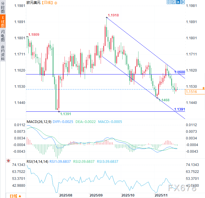 (欧元兑美元日线图,来源:易汇通)欧元兑美元当前交投于1.1500关键支撑附近上方。若明确跌破该水平,下行空间将进一步打开。下一关键支撑位于8月低点1.1391,更深层支撑则介于1.1214-1.1275区间,该区域由往年高点构成。若看空动能持续增强,这些支撑位将面临严峻考验。