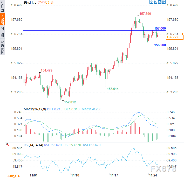 (美元兑日元4小时图,来源:易汇通)北京时间13:58,美元兑日元交投于156.71/72。