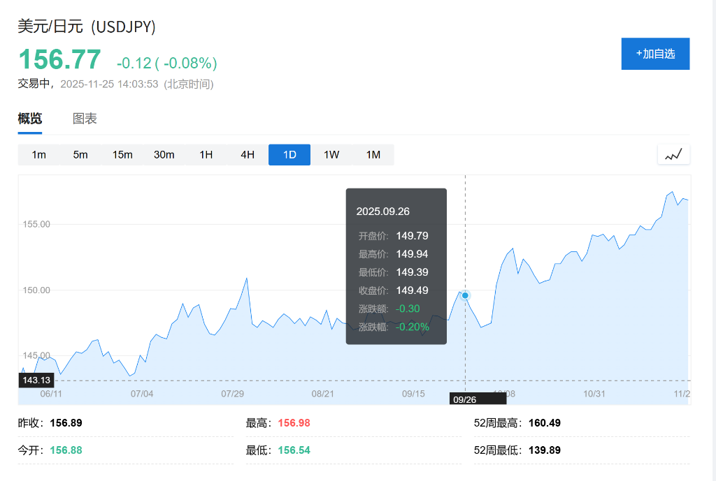 这一看涨呼声与日元近期的疲软走势形成鲜明对比。受日本首相高市早苗的支出计划可能恶化财政状况的担忧,以及市场对日本央行近期加息预期减弱的影响,日元本季度已下跌5.6%,成为十国集团(G-10)货币中表现最差的币种。截至东京时间上午11:51,日元兑美元汇率报156.67。