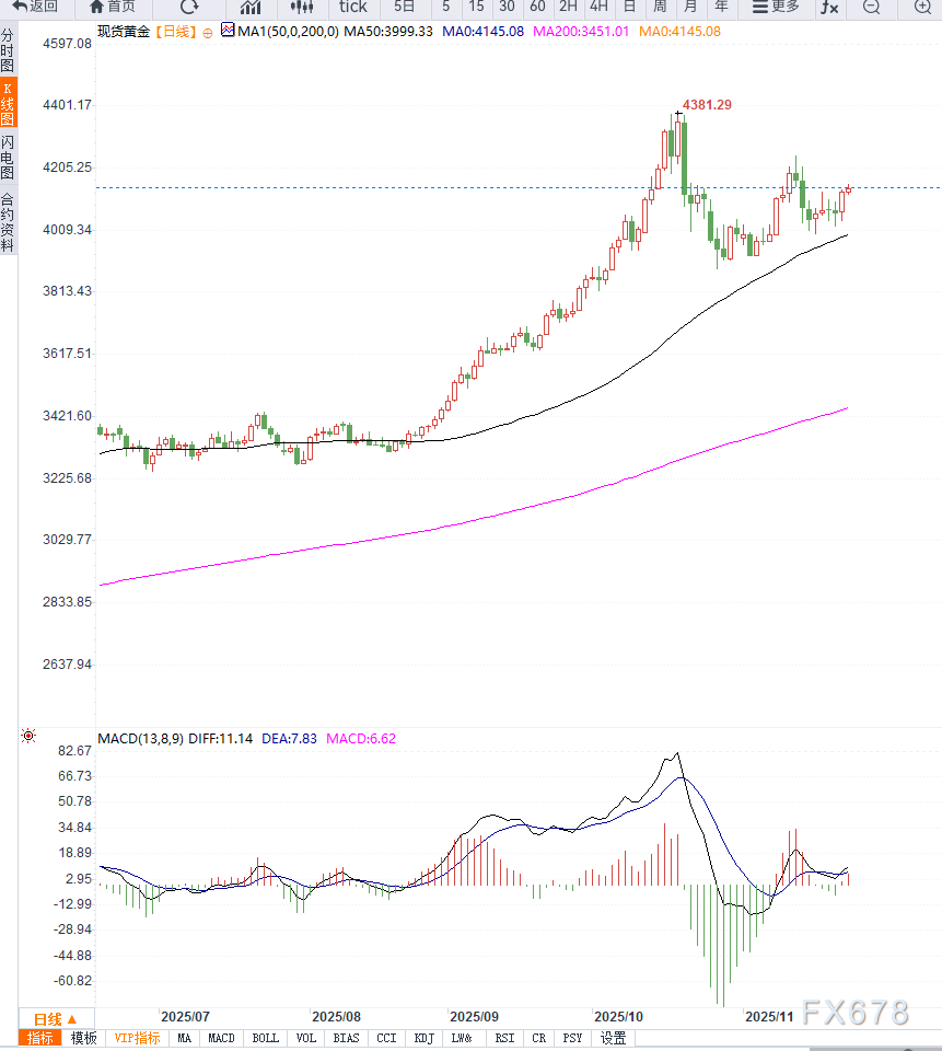 若失守 4100美元则更深的多重支撑位在4030美元附近,破位将把短期偏向转为空头,可能把价格拖向4000美元附近。