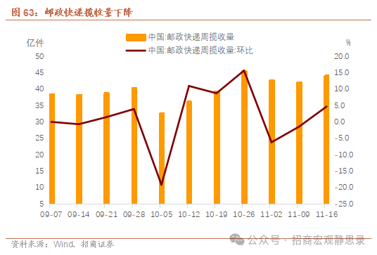 上周邮政快递揽收量44.19亿件,环比上升4.72%。
