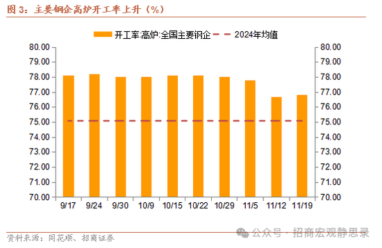 上周主要钢企高炉开工率为76.8%,环比上升0.1个百分点,同比增速为0.9%。