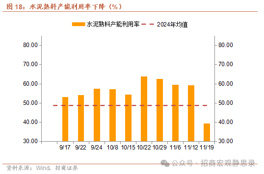 水泥熟料产能利用率为39,3%,环比下降19.92个百分点,同比增速为-10.3%。