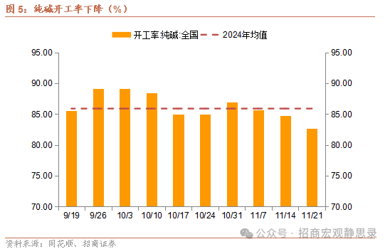 上周纯碱开工率为82.68%,环比下降2.12个百分点,同比增速为-1.5%。
