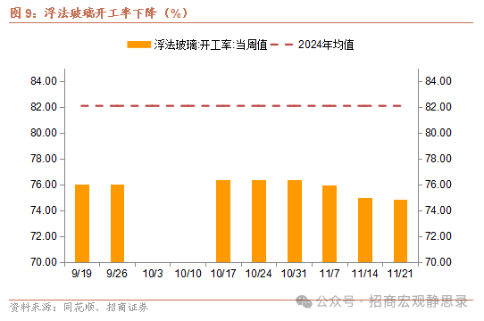 上周浮法玻璃开工率为74.86%,环比下降0.14个百分点,同比增速为-3.6%。