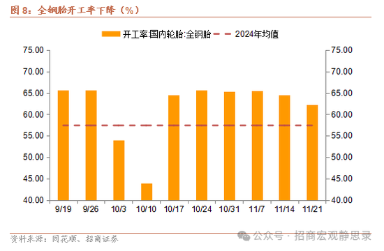 上周全钢胎开工率环比下降2.25个百分点至62.25%,同比增速为-0.6%,半钢胎开工率70.05%,环比下降3.63百分点,同比增速为-11.5%。
