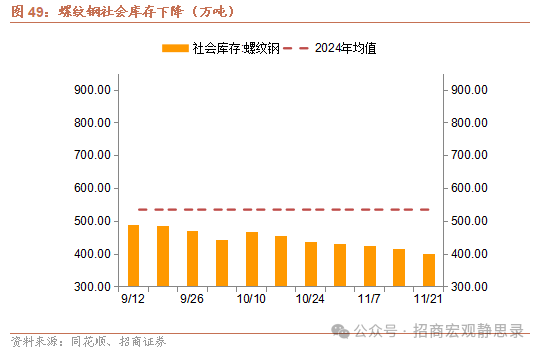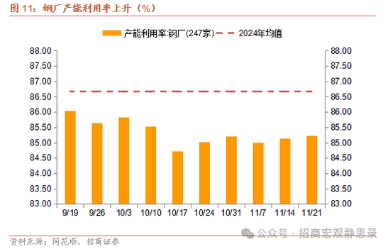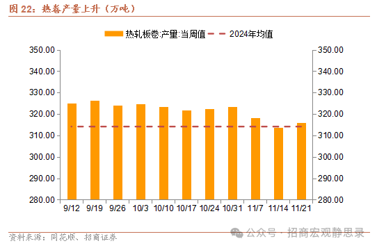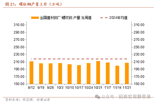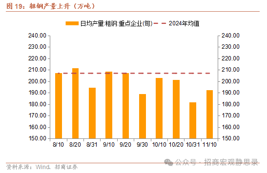 11月上旬重点企业粗钢日均产量为192.6万吨,较10月下旬上升10.9万吨,同比增速为-8.1%。