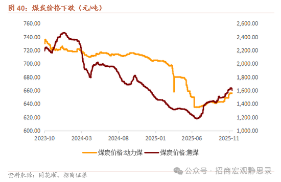 上周动力煤价格为656元/吨,环比持平,焦煤价格为1603元/吨,环比下跌33元/吨。