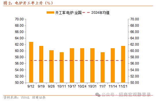 上周全国电炉开工率为61.54%,环比上升0.64个百分点,同比增速为-2.0%。