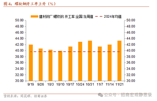 上周建材钢厂螺纹钢开工率为43.28%,环比上升1.31个百分点,同比增速为3.9%。
