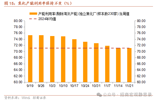 上周焦化产能利用率71.10%,环比持平,同比增速为-2.8%。