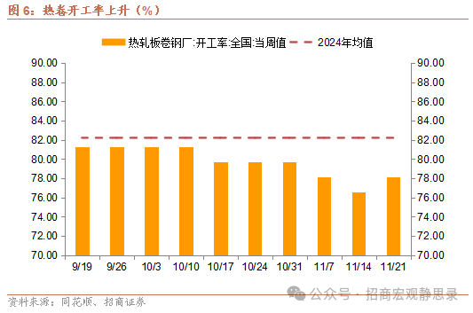上周热卷开工率为78.13%,环比上升1.57个百分点,同比增速为-3.8%。