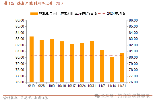 上周热卷产能利用率为80.73%,环比上升0.6个百分点,同比增速为1.3%。