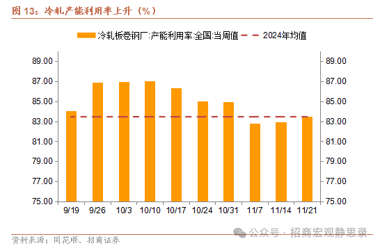 上周冷轧产能利用率83.51%,环比上升0.57百分点,同比增速为-0.2%。