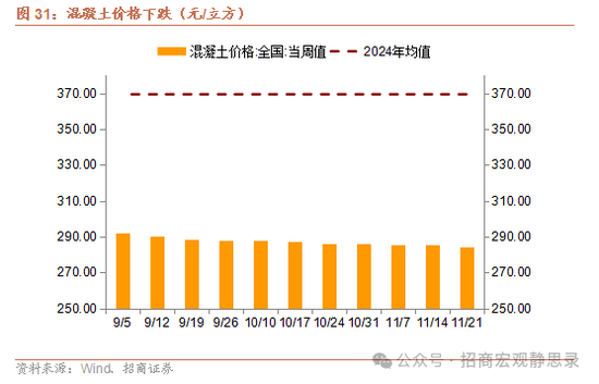 上周混凝土价格为284.2元/立方,环比下跌0.96元/立方,同比增速为-19.6%。