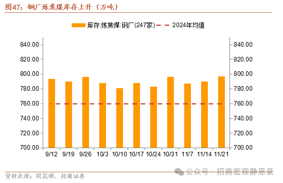上周钢厂炼焦煤库存环比上升6.91万吨至797.08吨。