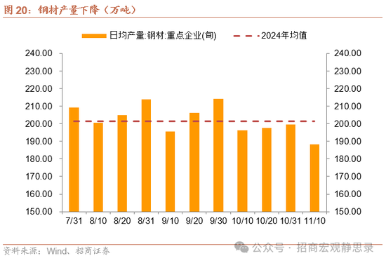 11月上旬重点企业钢材日均产量为188.4万吨,比10月下旬下降11.1万吨,同比增速为-3.5%。