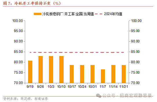 上周冷轧开工率为78.72%,环比持平,同比增速为-5.1%。