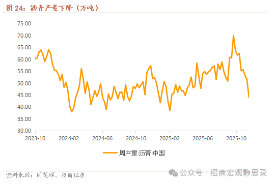 上周沥青产量44.1万吨,环比下降7.3万吨,同比增速为-21.3%。