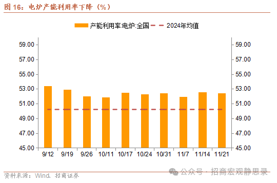 上周电炉产能利用率为52.41%,环比下降0.14个百分点,同比增速为-0.9%。