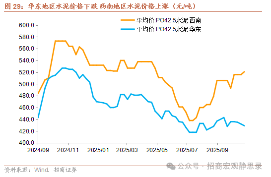 上周华东地区水泥均价为429元/吨,环比下跌3元/吨,西南地区价格为521元/吨,环比上涨5元/吨。