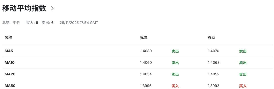 技术指标显示,日线级别布林带上轨切入点指向的1.4135区域水平为汇价提供短期动态阻力,布林带中轨运行线指向1.4050区域水平为其走势界定潜在强弱分化,布林带下轨指向的1.3965区域水平为汇价提供短期动态支撑。当前汇价下穿布林带中轨下方运行,显示多头动能的显著放缓迹象。布林带开口未呈现收缩现象,表明短期波动率有所下降。与此同时,14日RSI相对强弱指标降至50.70附近中性区域,表明当前多空力量处于相对均衡状态,汇价或进入震荡格局。
