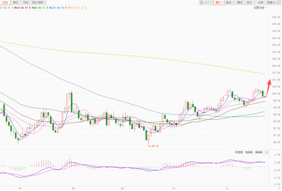 欧元兑美元价格从前期1.0177的新低开始筑底反弹,一路震荡上涨,目前欧元对美元整体全部运行在MA250日均线上方,呈明显的多头趋势。日内短线行情则建议看多震荡上涨的走势。