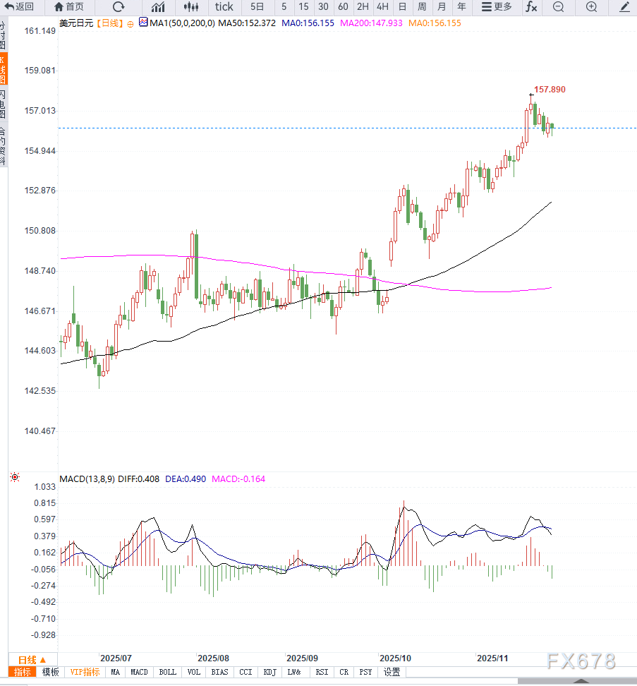 从技术角度看,美元兑日元的反弹在100小时均线(约156.70)附近再次受阻,使该位置成为短线关键阻力。若汇价突破并稳定在其上方,可能重新站上157.00,并进一步挑战157.50区域,甚至逼近上周触及的158.00高点。