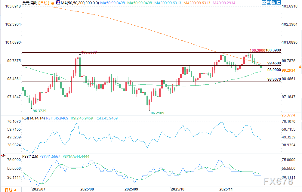 周一(12月1日)美盘时段,美元指数小幅下滑,空方持续测试关键支撑区域,一旦突破或引发更大幅度下跌。目前指数正逼近99.047的50日均线与98.991的震荡低点,若双双跌破,不仅意味着美元走势转弱,还可能触发清算盘与新的抛售潮,下一个下行目标将指向98.307-97.814的回调区间。当前,只要价格维持在99.669的200日均线下方,美元的最小阻力路径仍偏向下行。